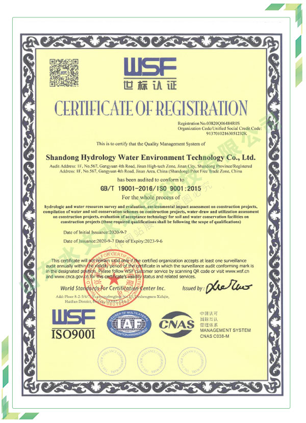 公司擁有水利工程設計、水土保持、水文水資源調查評價、水資源論證、建設項目環境影響評價、市政公用工程施工總承包、水利水電工程施工總承包、電子與智能化工程專業承包等資質,2017年通過質量管理體系、環境管理體系、職業健康安全管理體系認證;2020年被評為國家級高新技術企業,同年被中國水利企業協會推薦為第一批“合同節水服務企業”;2021年被山東省、濟南市評為 “專精特新”中小企業。業務范圍涉及水利工程設計;節水設計、改造、水平衡測試;山洪災害調查;城市水資源調查評價;建設項目水土保持方案編制、監測、驗收、水土保持規劃;水安全保障規劃、建設項目水資源論證、規劃水資源論證;建設項目環境影響評價;入河排污口論證;防洪影響評價;市政公用工程施工、水利水電工程施工、電子與智能化工程施工等。